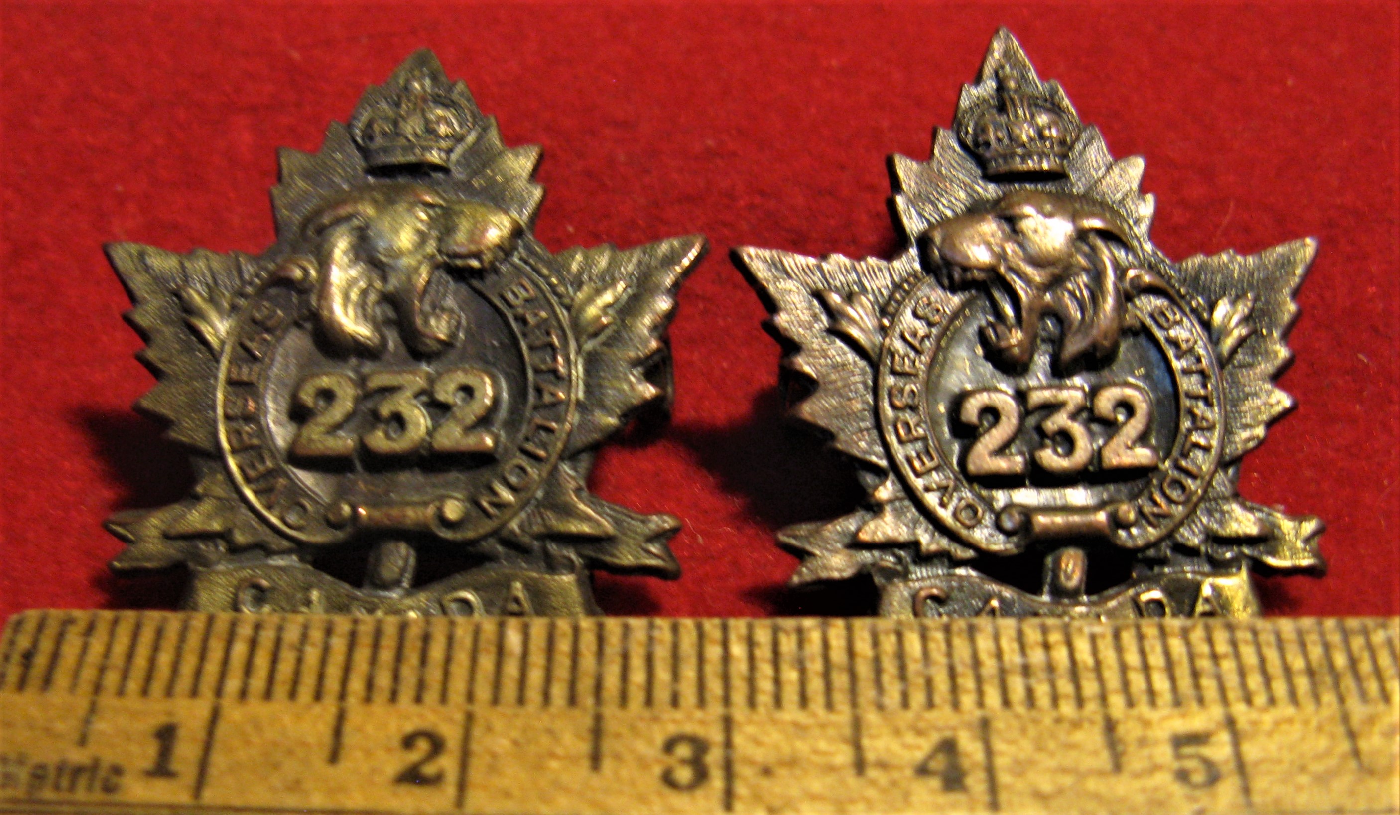 You are viewing a vintage CEF WWI era 232nd battalion collar badge set of two. These badges are made of pickled brass. All lug type attachments are original and in good order. They are made with the typical welded stem lugs as per scans above.