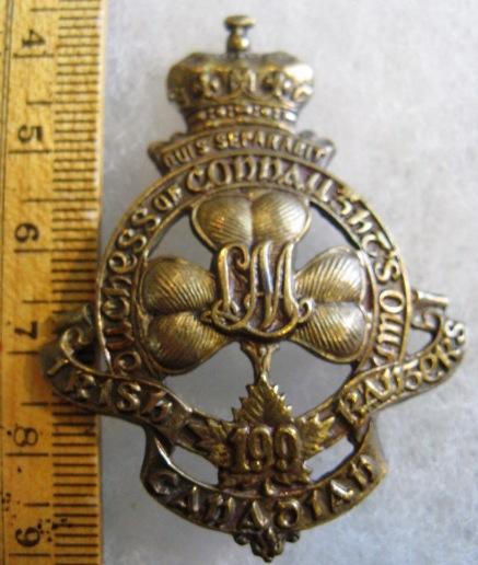 You are viewing a vintage CEF WWI era199th Battalion Cap Badge. Also Known as the Irish Canadian Rangers Duchess of Connaught's Own". This badge is made of fine highly detailed brass; made using the stamping method. Both lug type attachments are original and in good order. A very hard to find badge from the CEF era of the 20th century. ..This battalion came from the Montreal and Quebec area of Eastern Canada. The unit began recruiting during the winter of 1915/16 and sailed for England in December 1916. This battalion became part of the 23rd Reserve Battalion already stationed in England...