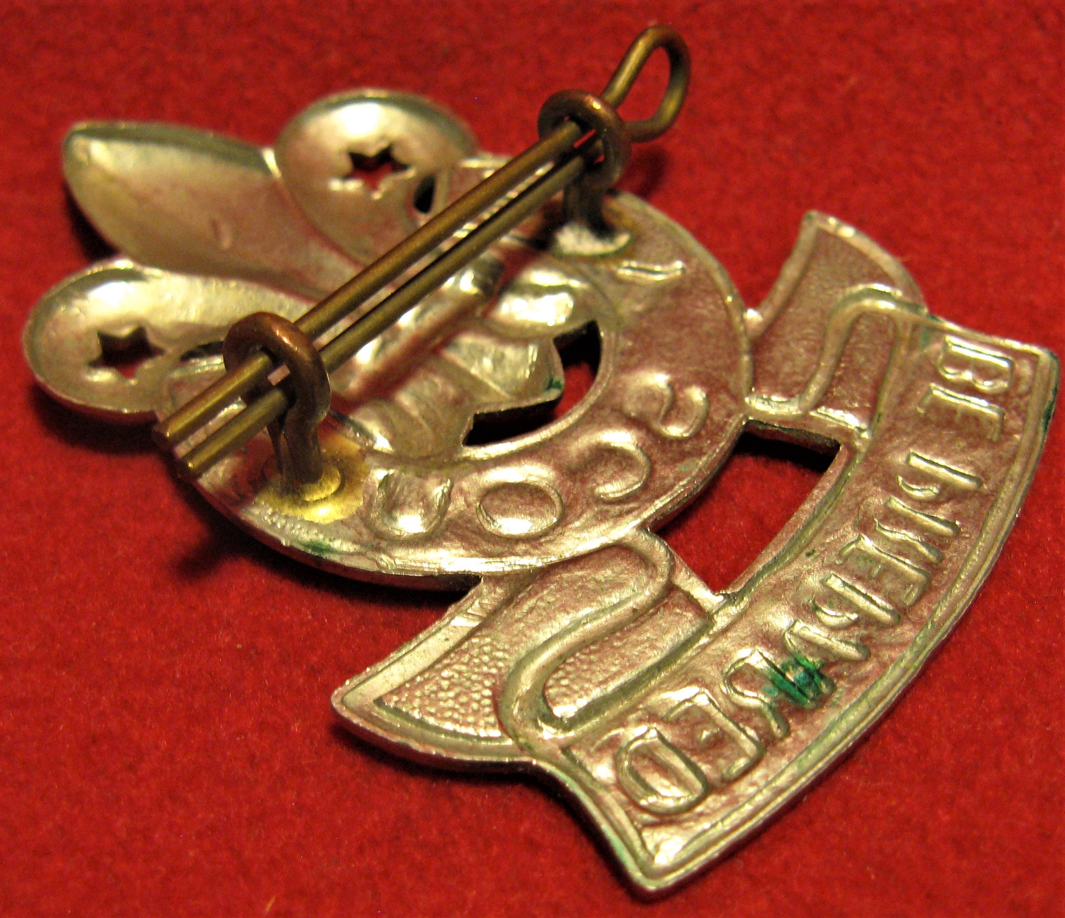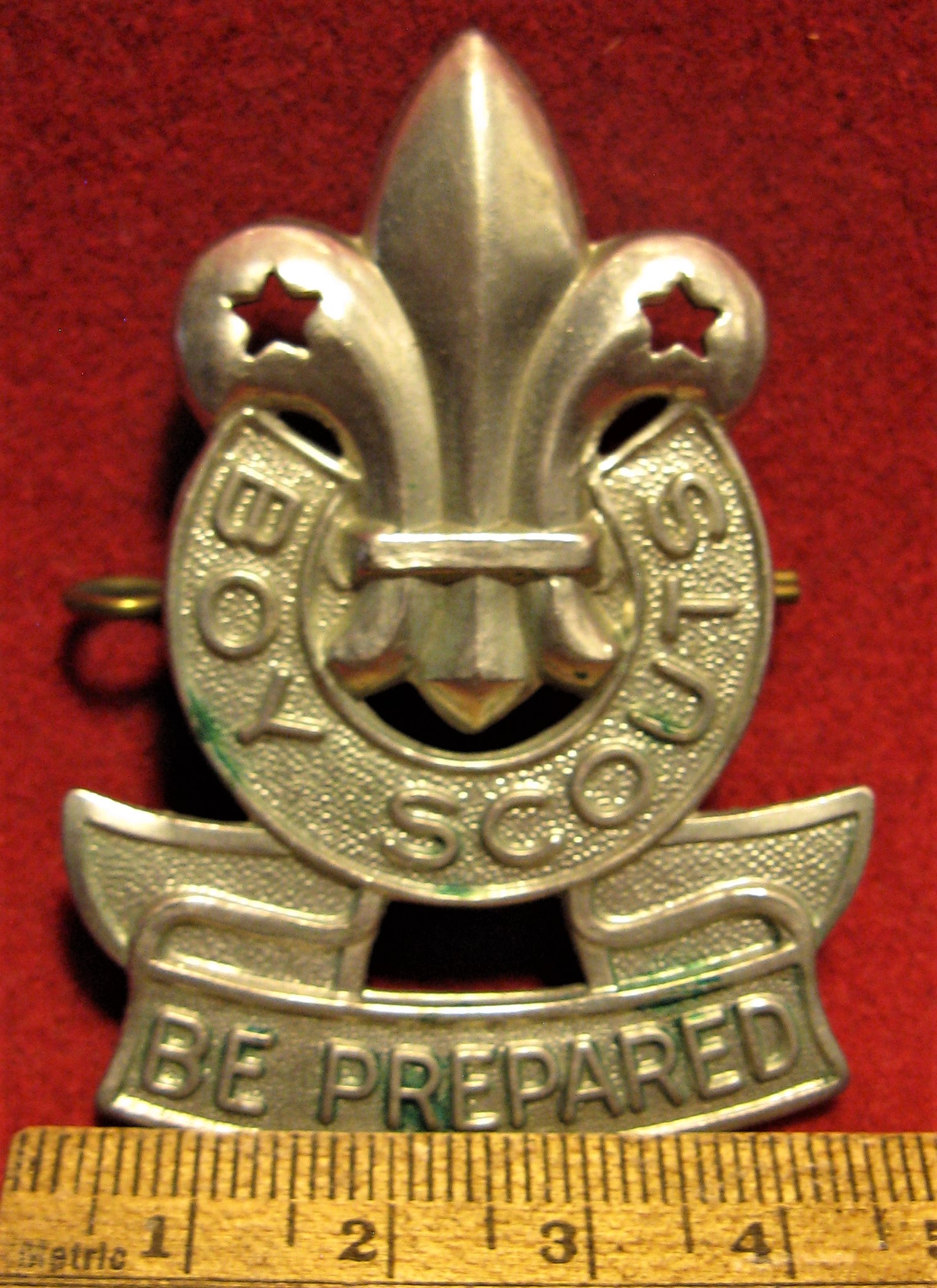 You are viewing an older style (post WW2 era) Scout Leader's Cap Badge. Lug type fasteners, made in the stamping method. This one is about 2 inches long, Has a dull steel-like finish. Comes with Cross pin.