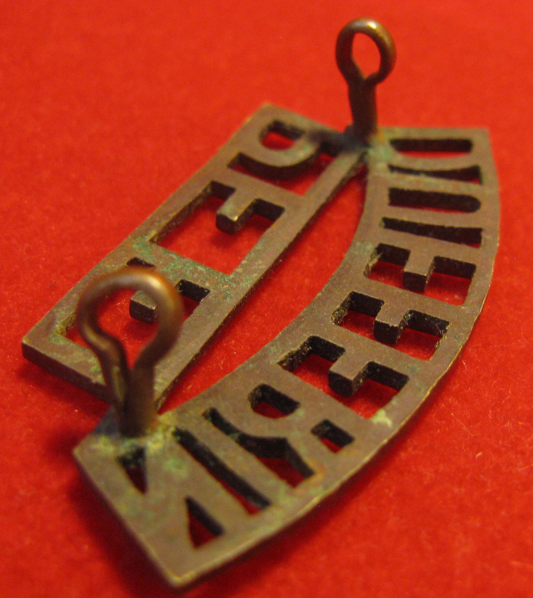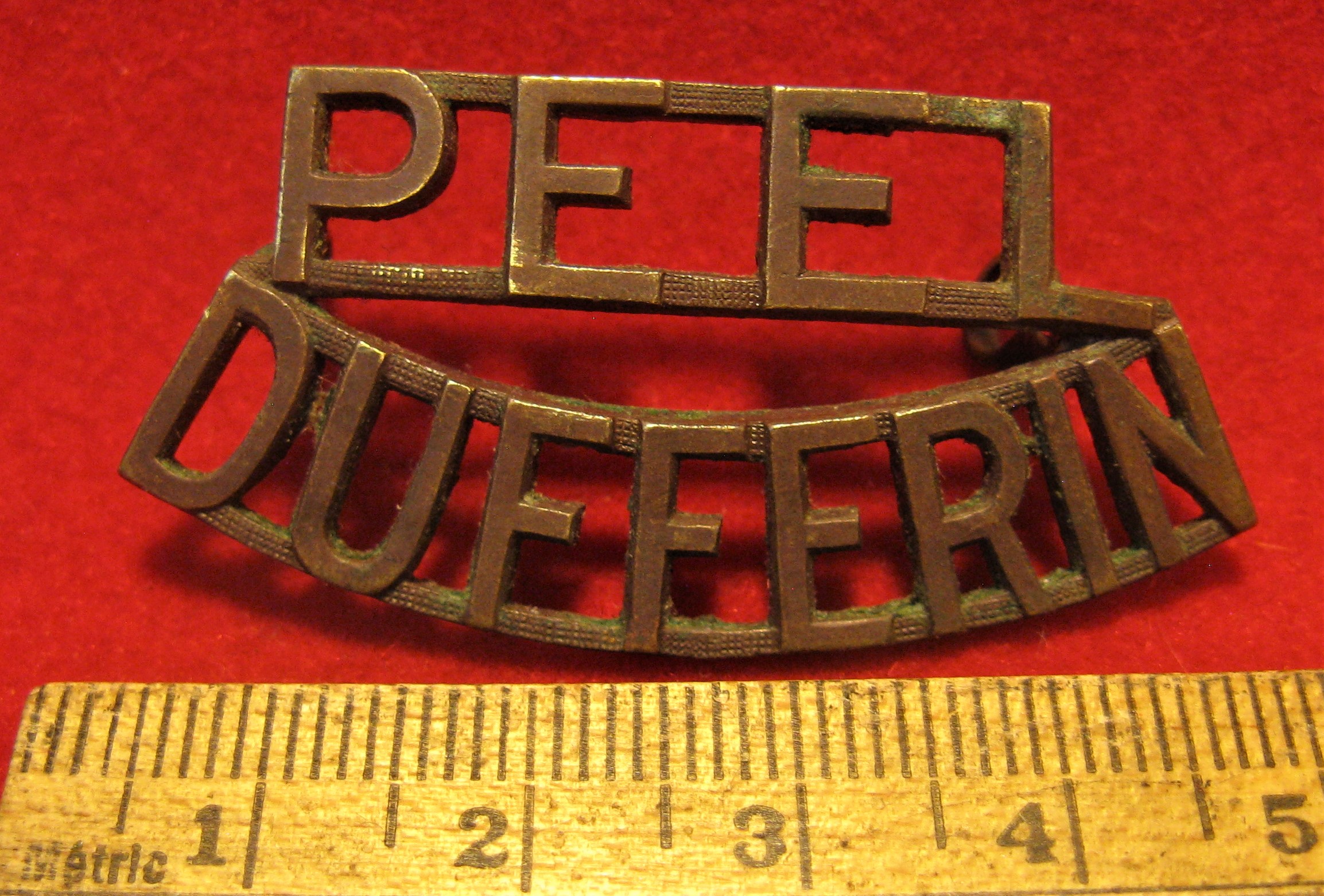 You are viewing a WWII era Peel & Dufferin Brass Shoulder Title. It is complete with both lugs original and in good order.