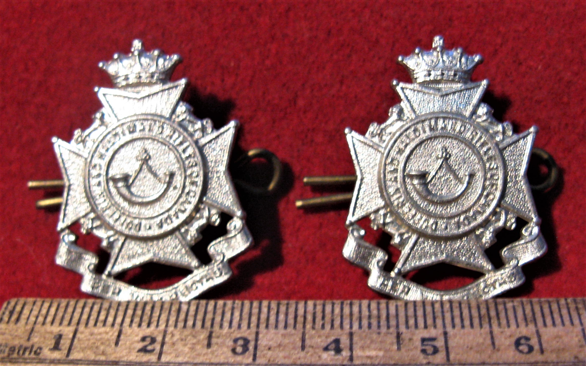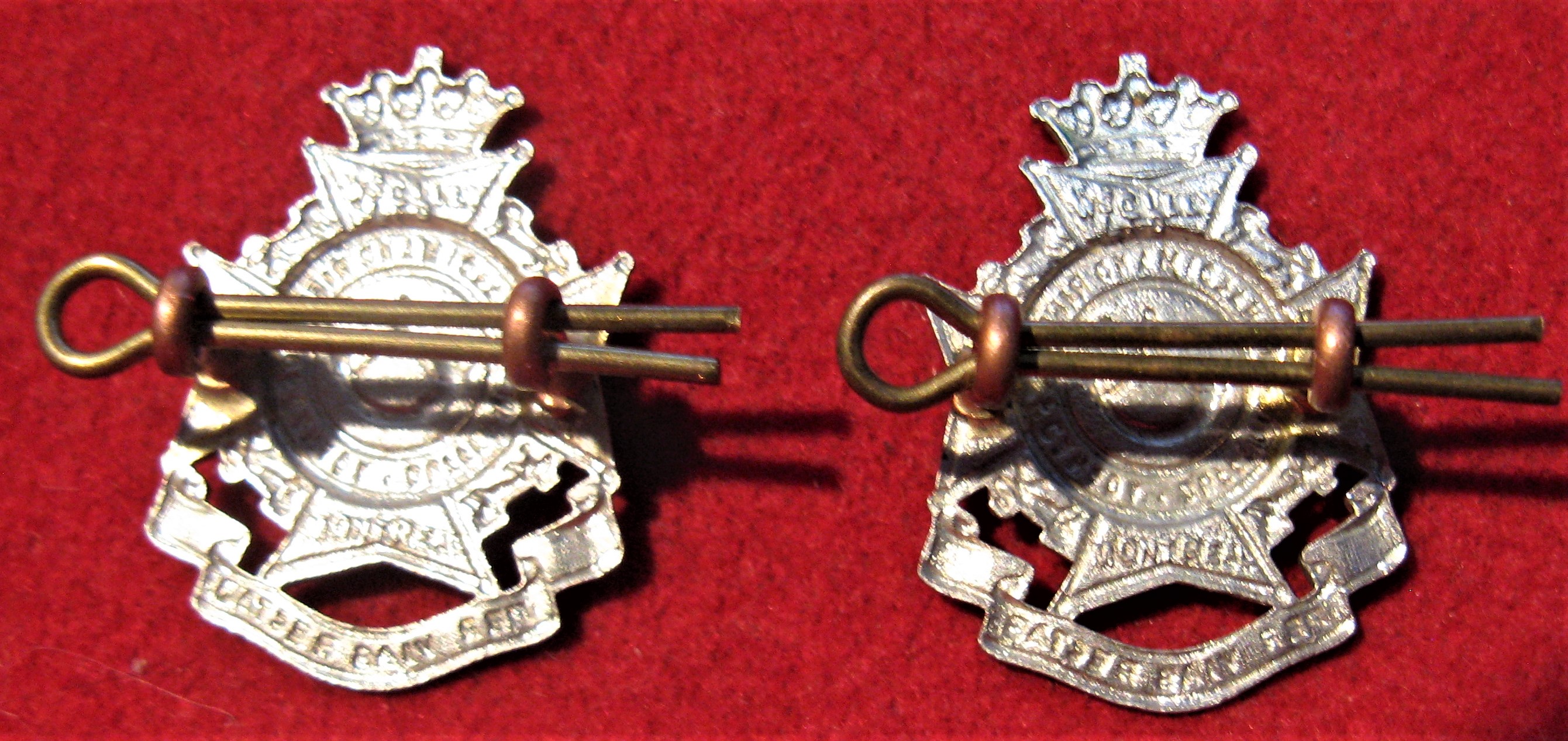 You are viewing a WW2 Era Dufferin & Haldeman Rifles of Canada Cap Badge and collar set (3). The cap badge is a larger badge, made of white metal, with both lugs original and intact. The collar set is also white metal with all lug type attachments in good order. An interesting Maltese cross design showing the battle Honors of the regimental history.