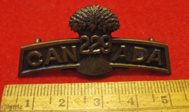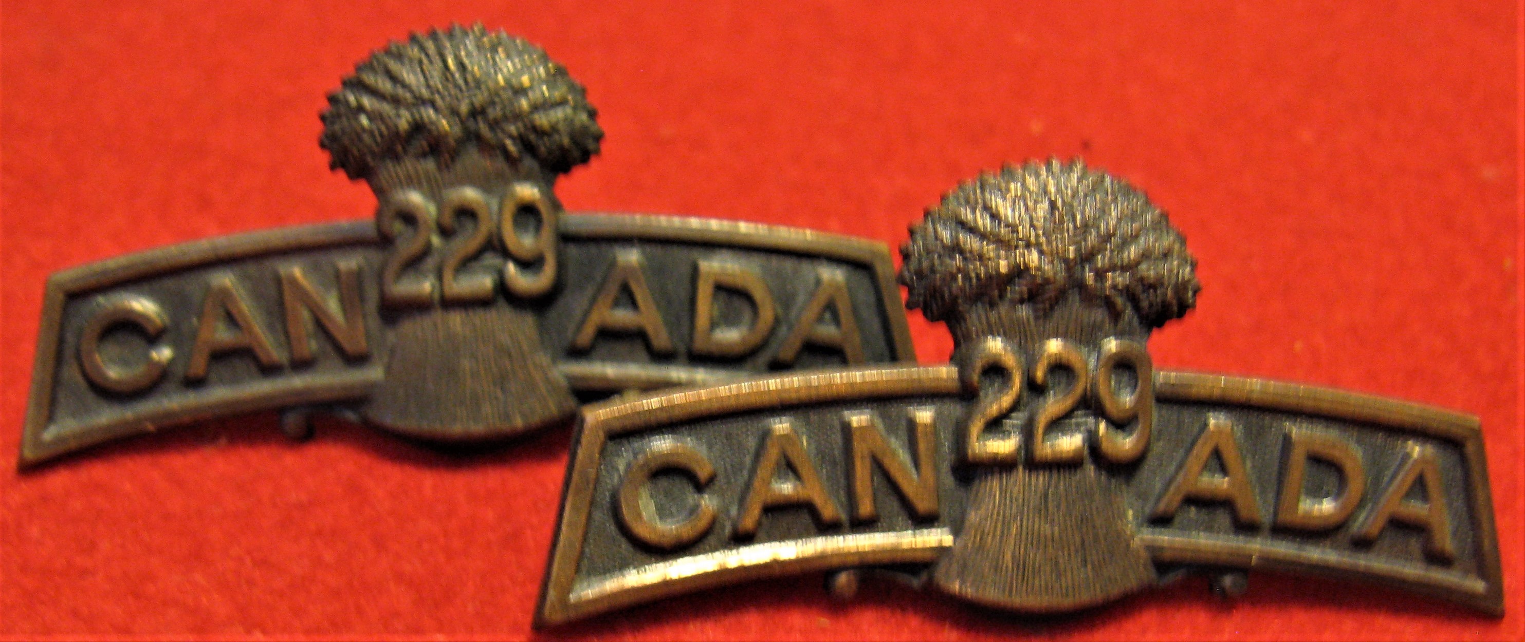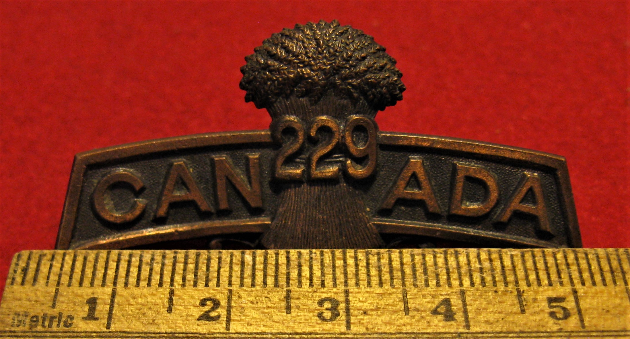 You are viewing a vintage WWI era 229th Battalion CEF Shoulder title. Made of "browning copper" it is in excellent overall condition, with a local Hallmark from "Crightons Moose Jaw". The original lugs are intact and in good order. Nice addition to enhance a cap and collar set. We have 3 in stock presently.