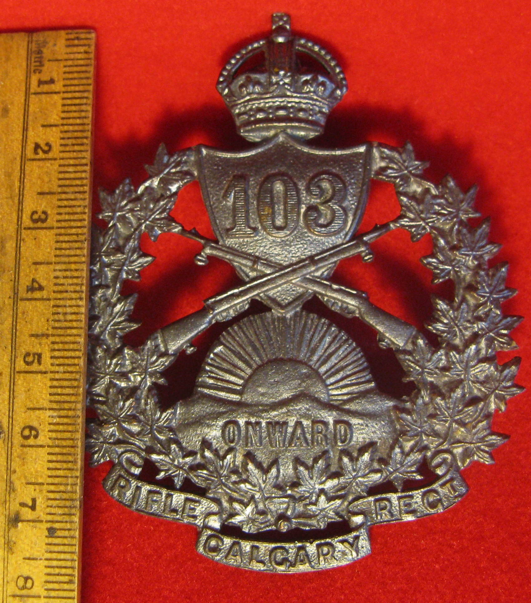 The 103rd Regiment was raised in Calgary as a militia unit. The first commanding officer was Lieutenant-Colonel W.C.G. Armstrong. The regiment's 1st Battalion consisted of eight companies stationed in Calgary. At the outbreak of WWI the regiment served as a recruiting depot to raise battalions for the CEF), the first being the 10th battalion. The 103rd Regiment was reorganized into two regiments in 1920 (the Calgary Regiment and the Alberta regiment,each of which was reorganized into two regiments a few years later.One of the resulting four regiments (the North Alberta regiment was disbanded in the 1936 reorganization of the Militia, but three present-day regiments claim descent from the 103rd: the South Alberta light Horse,the Kings Own Calgary regiment and the Calgary Highlanders. Also in stock we have a matching set of collars.