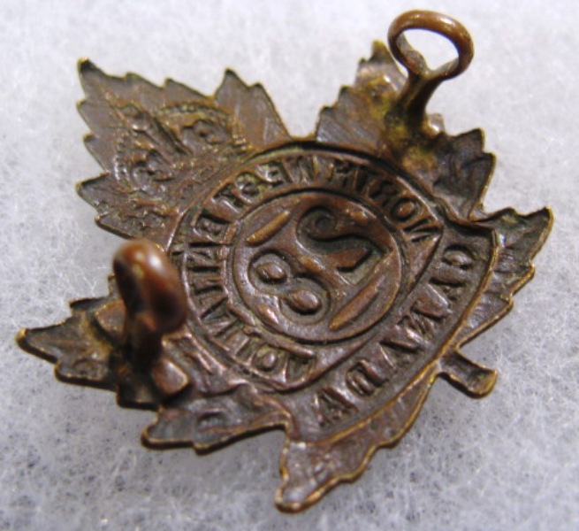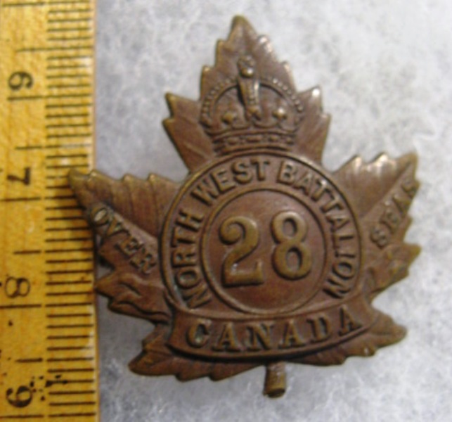 You are viewing a vintage CEF WWI era 28th Battalion Cap Badge. There are two known types of 28th batallion badges; this one is of the "overseas" variety. The badge is made of browning copper, and quite free of the greenish oxidation, so common to aged copper. Both lug type attachments are original and in good order...