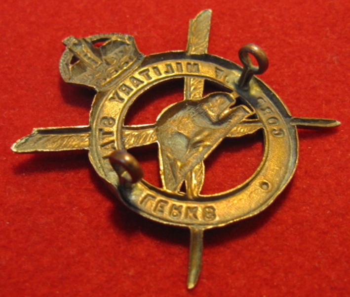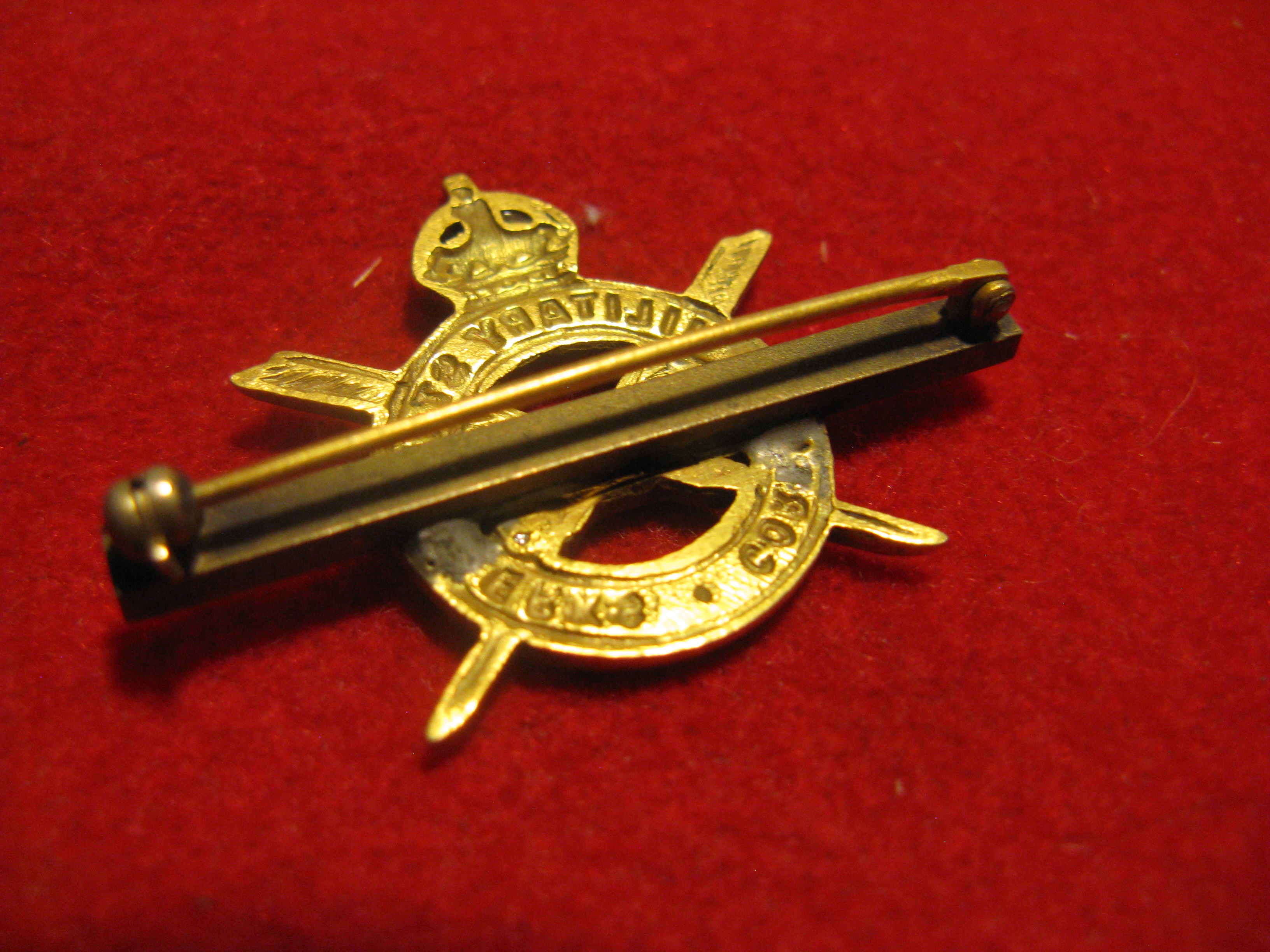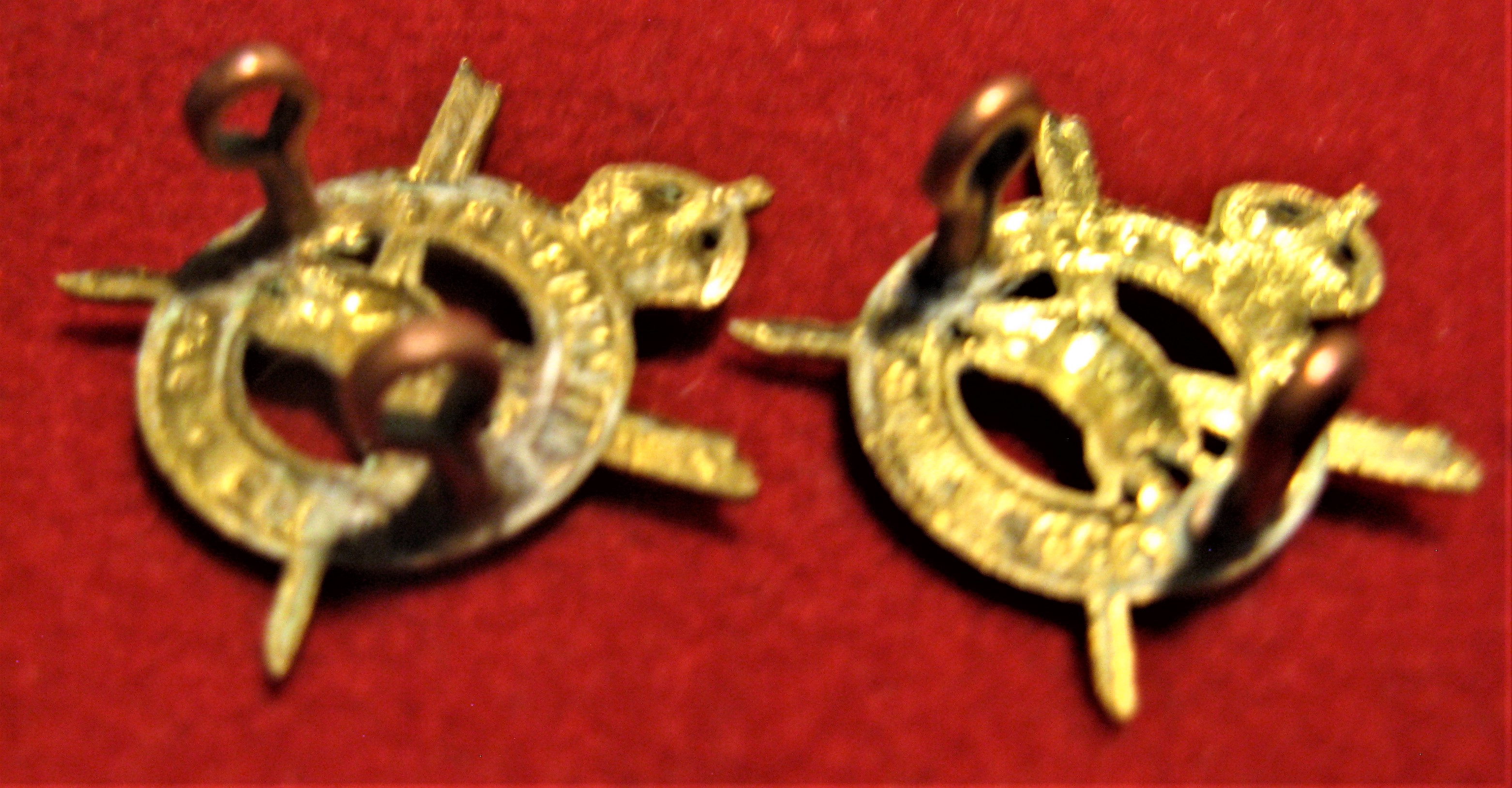 A clean copper WWI Staff Clerk cap badge set of 4. All lugs original and intact. Also includes a sweetheart broach with straight pin attachment in perfect condition