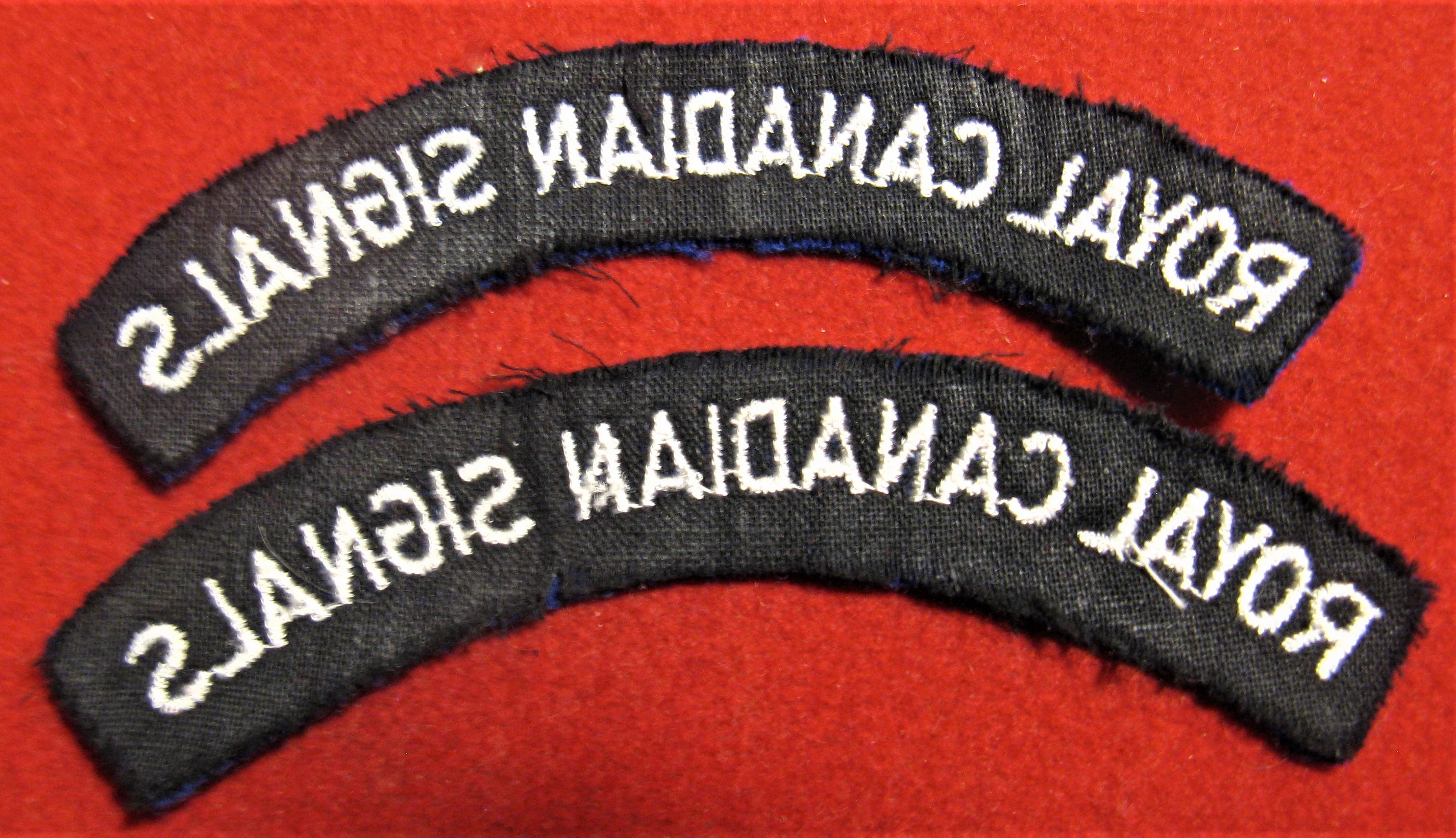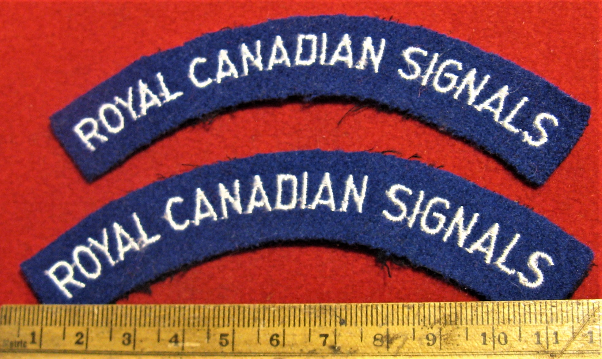 You are viewing a WWII era "Canadian Corps of Signals" shoulder title set of two. Made of blue felt with white lettering..