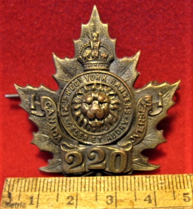 This battalion, called the "York Rangers" was raised in Toronto Ontario during the summer of 1916. They sailed in April of 1917 for England. Upon their arrival the 220th