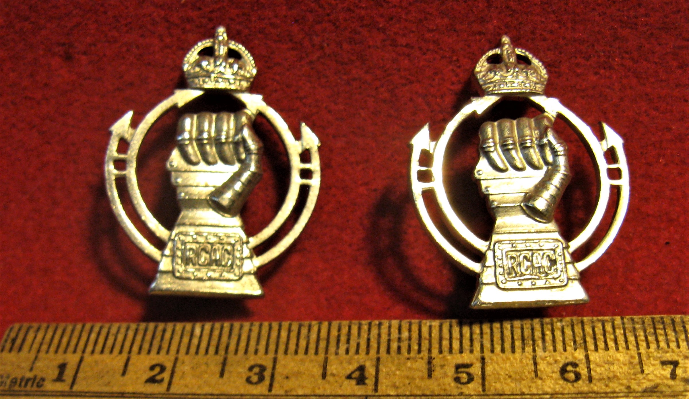 Above are the scans for a WWII KC era Cap and collar badge set of 3 pieces for the Royal Canadian Armored Corps. Comes with all original lug type attachments in good order. A nice white metal cap