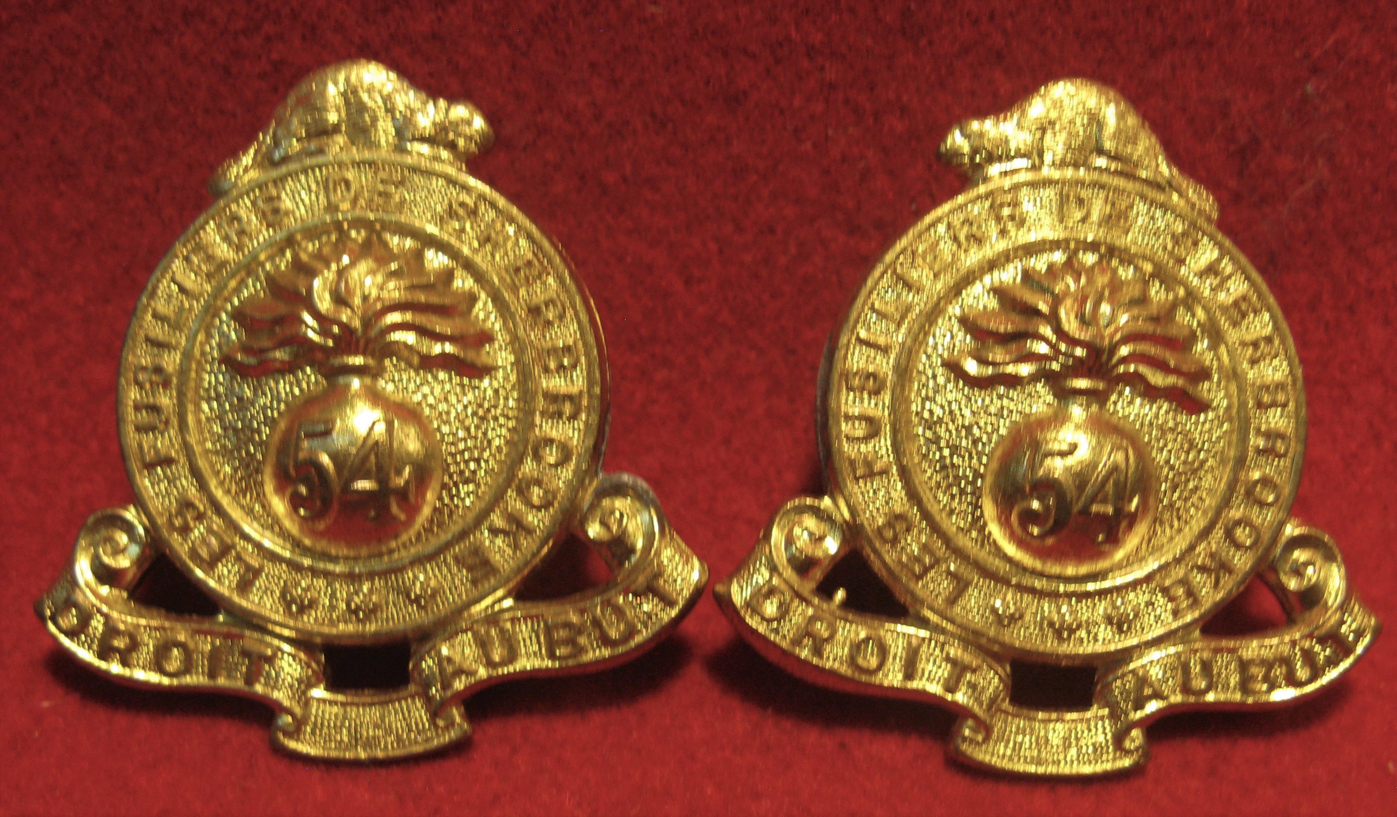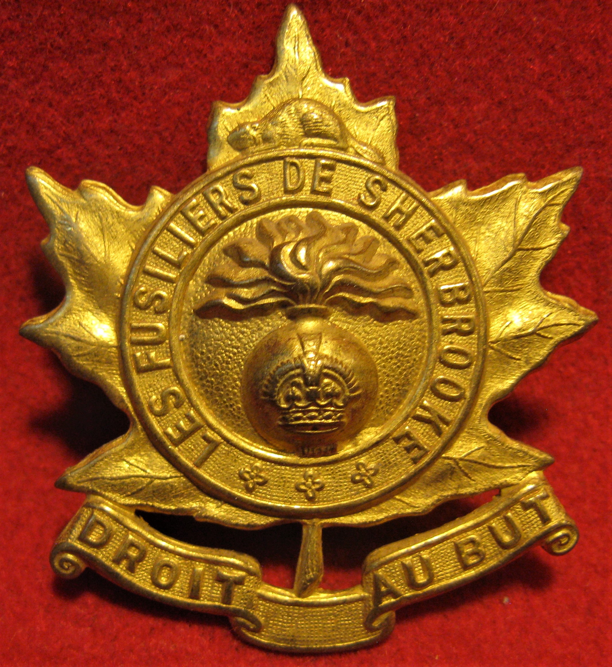 Some History: Early in WWII the Sherbrooke Fusiliers Regiment, was formed with men from Les Fusiliers de Sherbrooke and the Sherbrooke Regiment. Shortly after establishment, in 1941, the spelling was changed to "Fusilier", as in Sherbrooke Fusilier Regiment (actually grammatically incorrect in the French language in the collective sense). This singular form of the name was then on the cap badge and shoulder title. Further evidence of the singular form of the regimental name is found on later issues of the cap badge, which, as you may view above, consists of a flaming grenade and a banner with the motto, "DROIT AU BUT" in French. The motto and the bomb were borrowed from Les Fusiliers de Sherbrooke, which has a design, where in the center is a horse's head surrounded by the words "SHERBROOKE FUSILIER REGIMENT". (you may view one in our collection) The horse comes from the family coat of arms of Sir John Cope Sherbrooke, namesake of the home city. Only during 1940 was the regimental name plural, as you see above. Official Canadian Forces names are not to be translated haphazardly. After General Order 42/41 and General Order 62/41, the name 'Fusiliers' changed from the plural to the singular 'Fusilier' form. Its Royal Canadian Armoured Corps lineage, battle honours and armoured traditions are perpetuated by the Sherbrooke Hussars through the Sherbrooke Regiment. Les Fusiliers de Sherbrooke is now an infantry regiment and shares those battle honours.