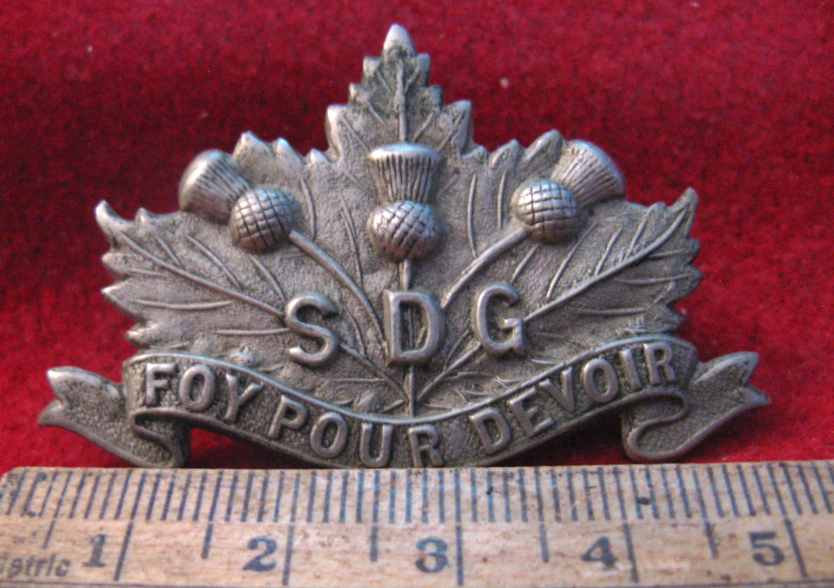 Above are the scans for a large format Stormont Dundas & Glengarry Highland Collar badge. Made of white metal with both original lugs intact and in good order.