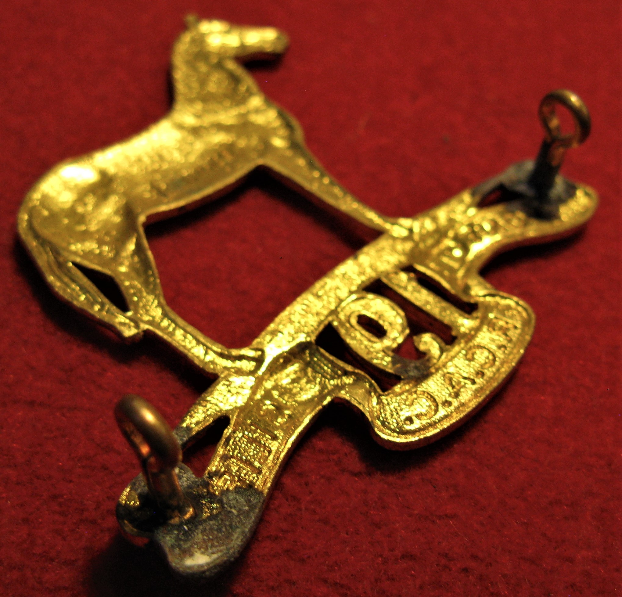 RCAC This badge is a variant on the thick tailed version. Note the thin tail hanging down in the scans. Made of anodized brass, this badge comes with both original lug type attachments in good