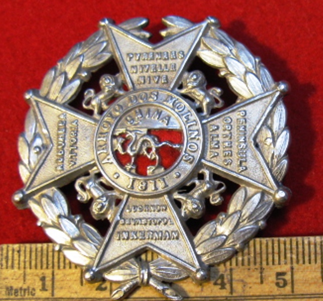 Now this badge appears to be related to the British Border Regiment but has no crown nor name scroll at the bottom. Does have a voided center, and the appropriate battle honors, however. Maybe you know more!