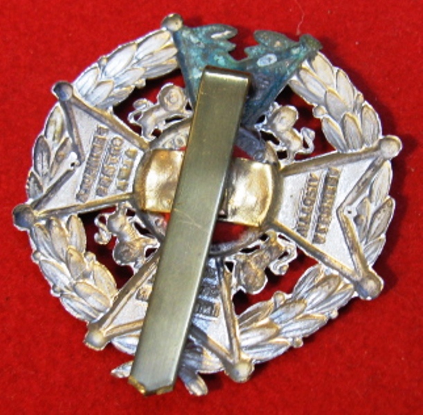 We have presently in stock a small collection of some 30 pieces of Border Regiment related badges. They run from the 1787 period of army reformation through to post WWII. Many have been uploaded to our web site, and may be viewed in the "British & Commonwealth" Catagory to the left in the list. This badge may be a WWII era piece as shown by the typical type of tang arrangement on the back. A silver colored white metal badge with Battle Honors clearly shown. This varient has a voided center. If you have better information we would appreciate you letting us know more details. Thanks
