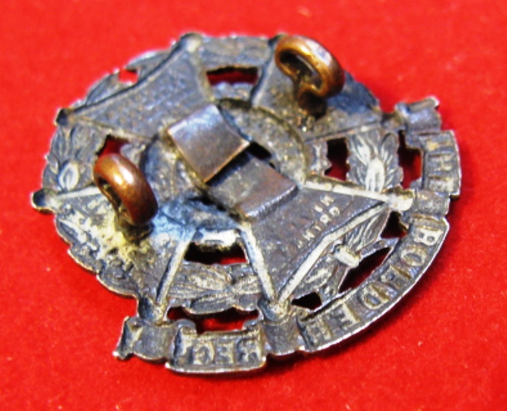 You are viewing the scans for the first of three British Border Regiment collar badges we have presently in stock. They run from the 1914 WWI through to WWII. This badge appears to be a WWI era piece as shown by the typical type of double lug arrangement of the fasteners. An chocolate brown copper color with Battle Honors clearly shown. This varient has a voided center, wiht no crown. It has both original lug type attachments, in good order.