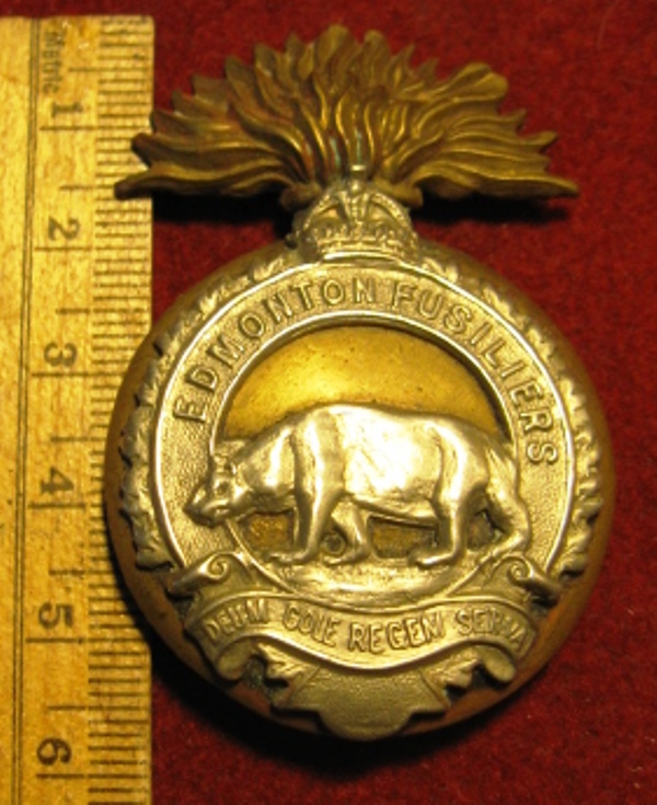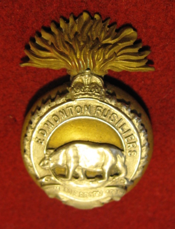 The Edmonton Fusiliers were mobilized just after war was declared and then placed on active service on 1st of September 1939 for local protection duties. The original sections were disbanded at the end of 1940. The the 1st Battalion of this regiment had been mobilized on 24 May 1940. It served in Canada in a home defense role as part of the 13th Infantry Brigade, 6th Canadian Infantry. A 3rd Battalion from the Edmonton Fusiliers,was called up for active service on 12 May 1942. They served briefly in Canada as home defense, and was attached to the 16th Infantry Brigade, 8th Canadian Division. They were disbanded at the end of the summer of '43. With the closure of the war in 1945, the 1st Battalion was also disbanded.