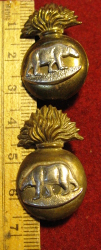 The scans above show a second 3 piece set of uniform badges for the WW2 era Edmonton Fusiliers. A bi-metal brass & silver badge set depicting a wreathed bear figure on the cap badge and two opposing bear figures on the collar set. The badges are in excellent condition with original lug type fasteners on the cap badge and on the collar device set, all in good order. Cap badge has a "Skully" hallmark.