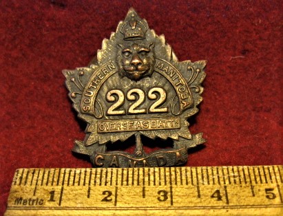 Above are the scans for a WWI 222nd Battalion collar badge. (Copper composition) Both tang type fasteners are original and in good order.
