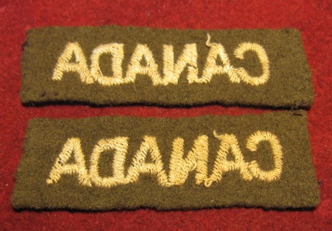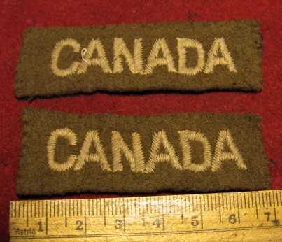 You are viewing a set of two WWI "Canada" title shoulder flashes . Made with a beige embroidery over a darker brownish khaki material, typical of the period. A fine example of an excellent condition, field used, shoulder flash set made over 100 years ago in WWI.