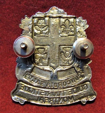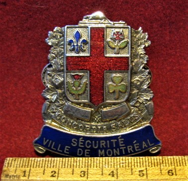 Above are the scans of a "Ville de Montreal Securite" cap badge. This 1970's enameled badge is in excellent condition with its enameled features being nearly 100%. The spinner type attachments on the cap badge are original and in good order.