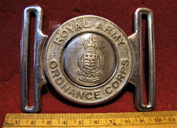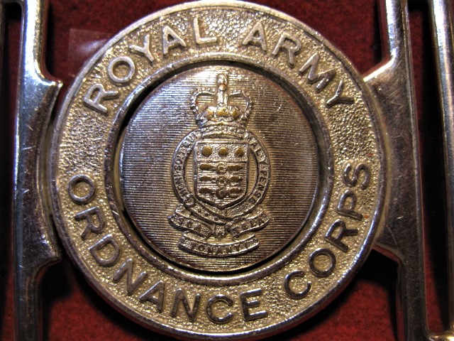 You are viewing the scans for a QC Era Royal Army Ordinance Corps Belt Buckle. A 2 piece buckle made of white metal or plated bronze, with its 2 belt attachments built in. This one is hallmarked as "clasps by J.R.Gaunt" and maker is noted as "belt by Hobsons". Was used with the heavy web service belt, and later with the white plastic dress belt of the 1980's era. View scans for details.