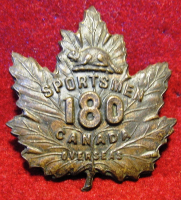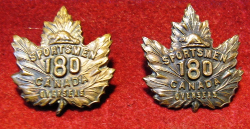 You are viewing a CEF WWI era Canadian 180th Battalion Cap badge and collar set of 3 pieces. This battalion was known as the "Sportsmen" Made of browning copper, with all lug type fasteners, in good order, and complete with no chipping or damage to the high relief design features.