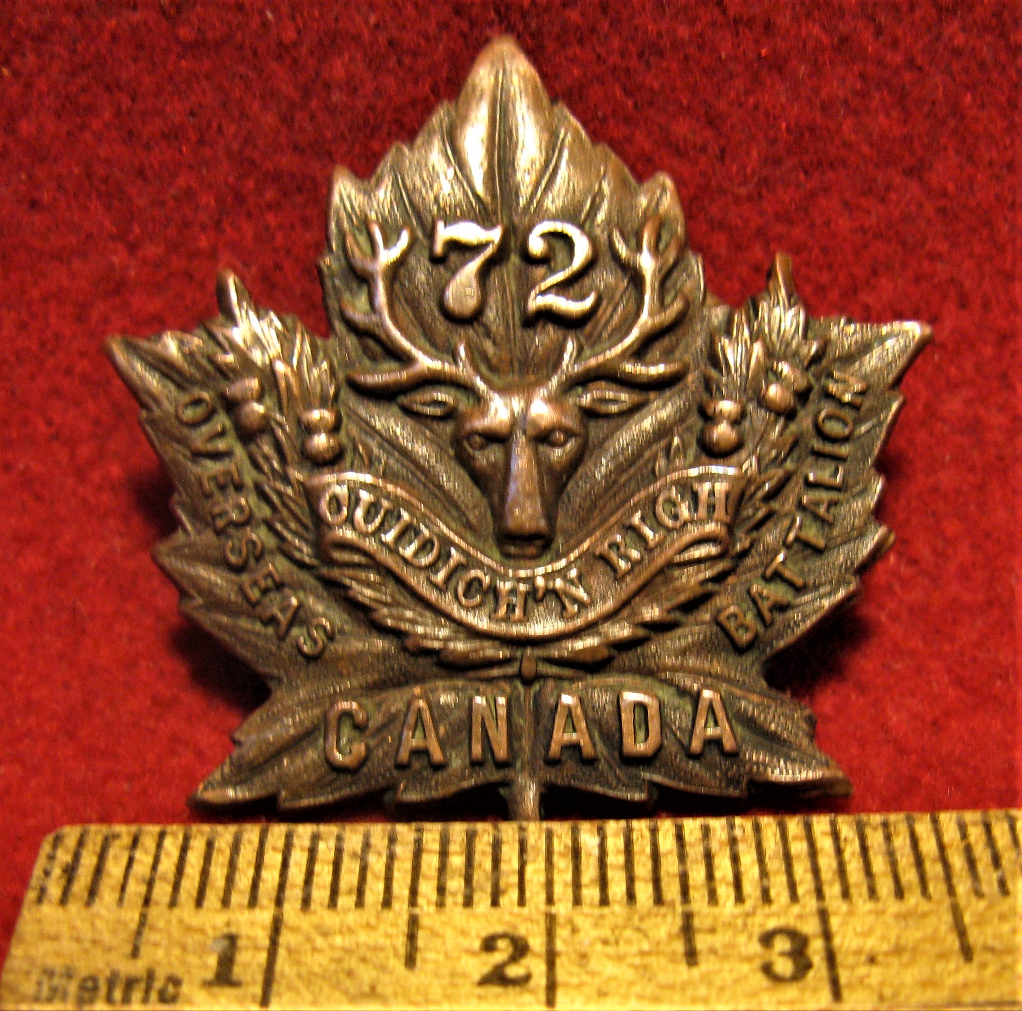 Above you may view the scans for a WWI 72nd Battalion sweetheart/officer collar badge. This beautiful example has a straight pin type attachment. A copper badge with very nice patina giving evidence to its age. A beauty for any collector of Canadian CEF badges.