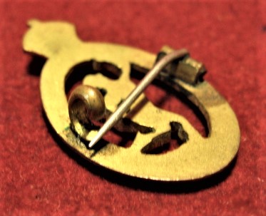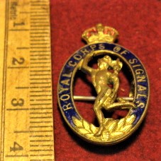 Above you may view the scans for a WWI era Royal Corps of Signals sweetheart badge. This beautiful example is complete with straight pin attachment. The enameling is still excellent. A brass base enameled badge, a beautiful sweetheart commemorative. The badge is still complete and in good order but does show minor signs of its age. (view scans)