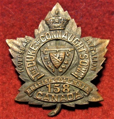 The 158th (Duke of Connaught's Own) Battalion, CEF was a unit in the Canadian Expeditionary Force during the First World War. Based in Vancouver, British Columbia, the unit began recruiting in late 1915 in that city. After sailing to England in November 1916, the battalion was absorbed into the 1st Reserve Battalion on January 6, 1917. The 158th (Duke of Connaught's Own) Battalion, CEF had one Officer Commanding: Lieut-Col. C. Milne. The 158th Battalion is perpetuated by The British Columbia Regiment (Duke of Connaught's Own)