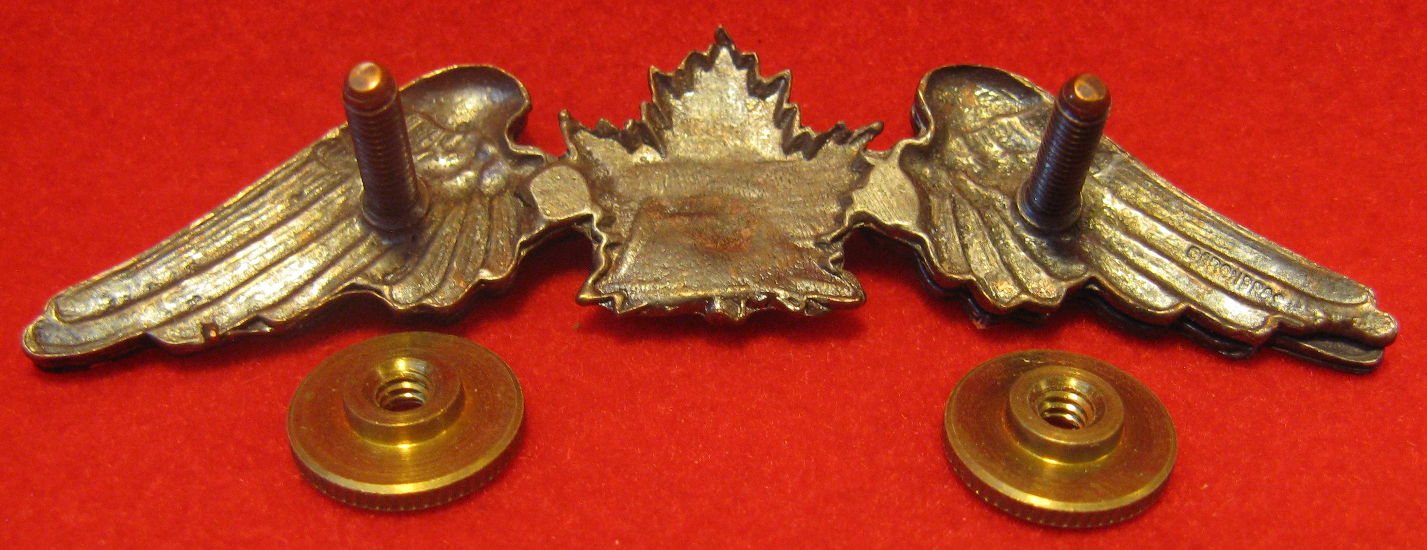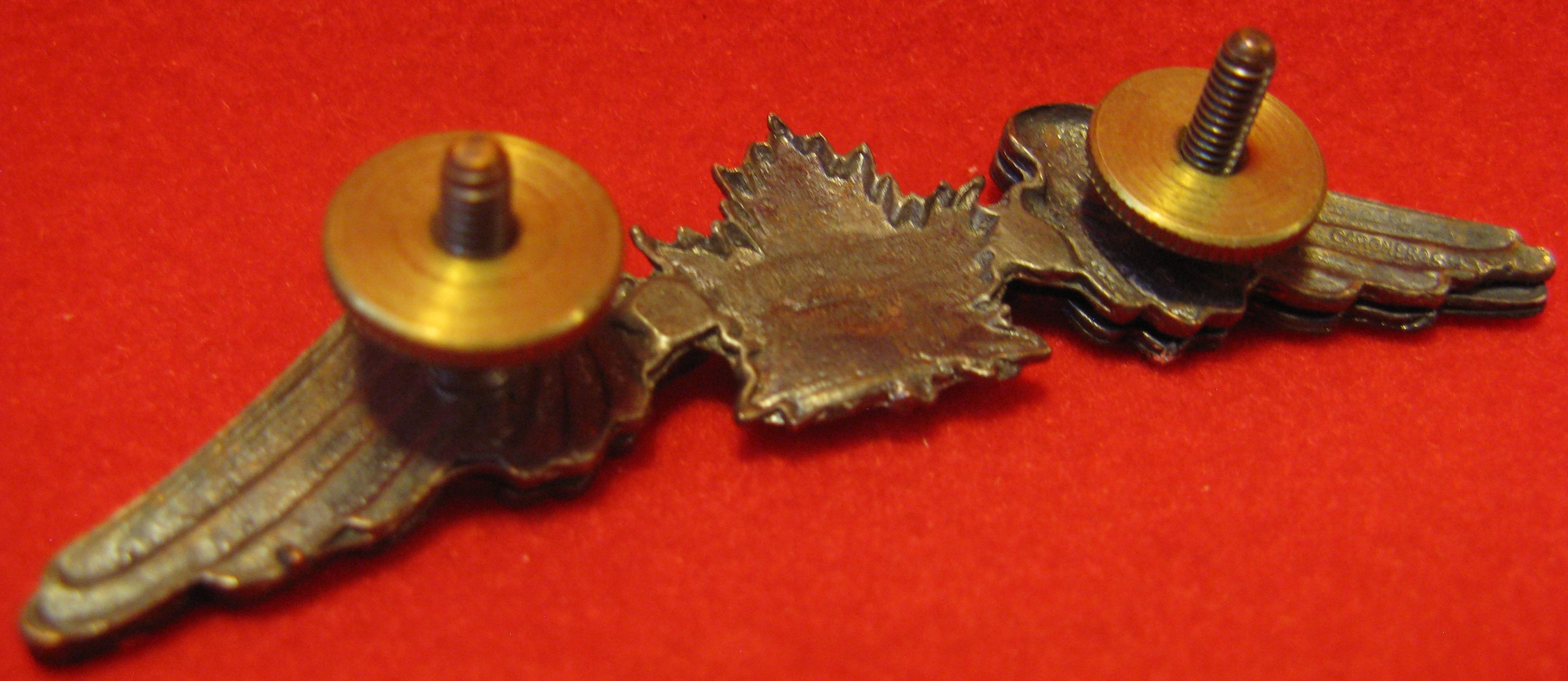 You are viewing a rare type of Canadian Air Force uniform badge of 1920's vintage. Note how the wings of this specimen are connected to the maple leaf, consequently these badges were quite