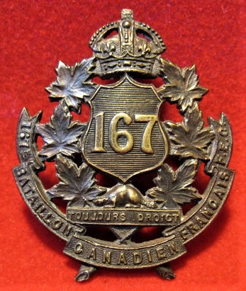 Above are the scans for a WWI 167th CEF Battalion cap badge. It is of browning brass composition with both welded lugs original and in good order. Maker marked "Caron Freres Montreal" and dated (unusual) 1916. Generally very clean with little wear from field use.