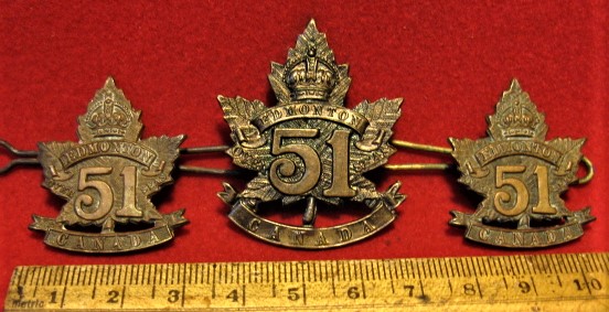 Here you are viewing a vintage CEF WWI era 51st Battalion Cap and collar badge set of 3. This badge set is in excellent condition. All lug type attachments are original and in good order. A hard to find set of 100 year old badges..