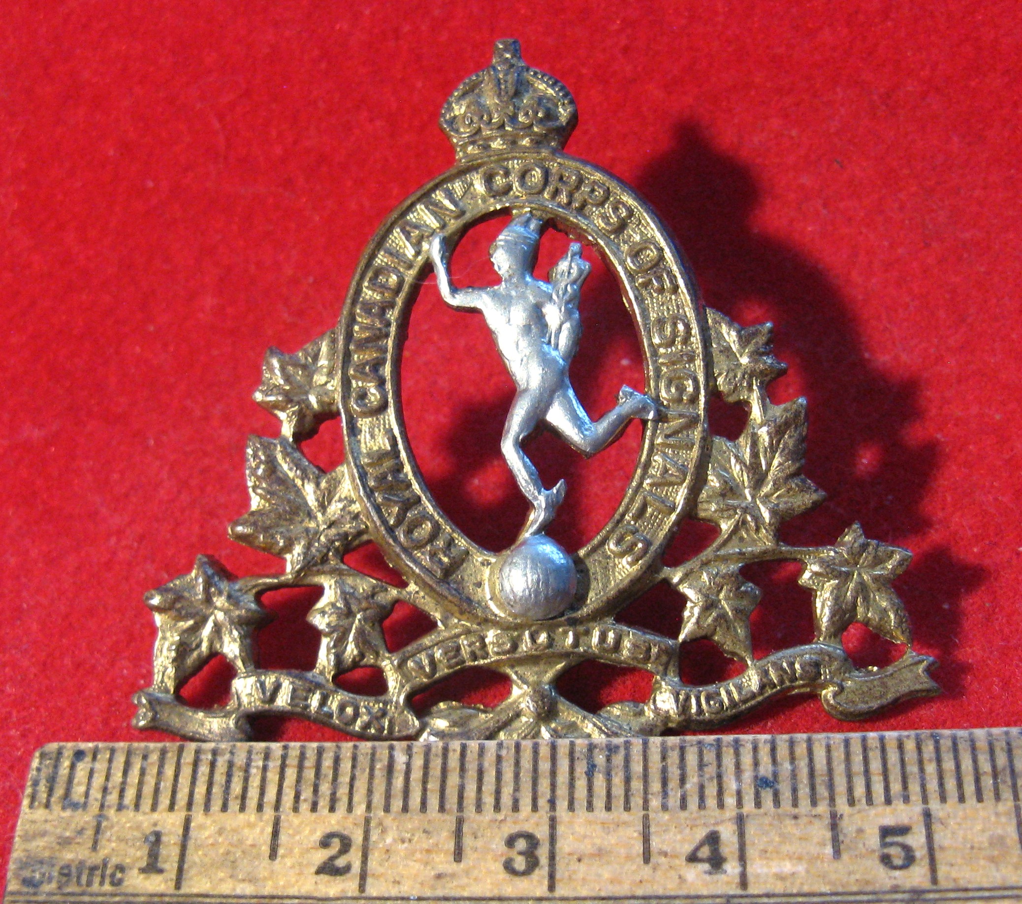 A very fine WW2 Royal Canadian Corps of Signals ( RCCS ) cap badge. Comes with both original welded lugs intact and in good order. Made of solid brass with a silver plated overlay of the Mercury figure. This is a rare and beautiful keepsake from the bygone era of this prestigious corps.