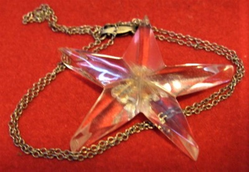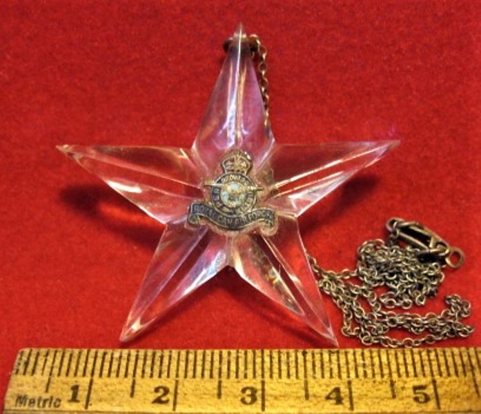 You are viewing a WWII RCAF sweetheart pendant. This pendant is made of celluloid material, with a small RCAF insignia inserted into the pendant celluloid, in the center of the star shape. Some have concluded that this celluloid was the material used for the cockpits of the WWII aircraft . The really unique feature of this sweetheart pendant is its shape. The star shape is not one I have seen previously. The chain and clasp are still in quite usable condition. View scans for details.