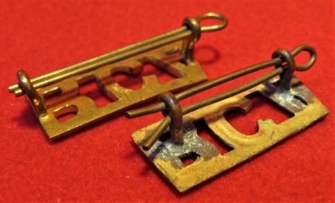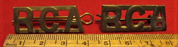 Above are the scans for this WWII era RCA shoulder title set of two . A clean badge set, made of brass, and comes with both sets of horizontal lugs original and in good order, as well as its cross pins as found.