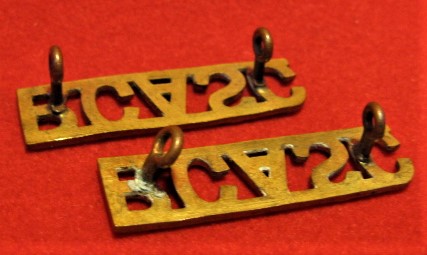 Above are the scans for this WWII era "RCASC" (Royal Canadian Army Service Corps) shoulder title set of two. These examples are made of brass. The lettering is similar to the RCHA lettering in that listing. They come with all horizontal welded lugs original and in good order.