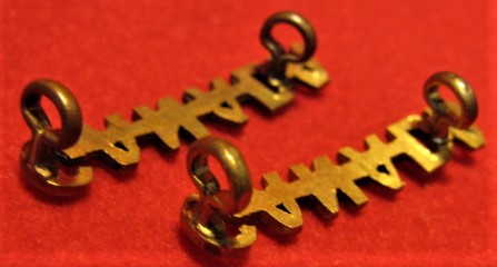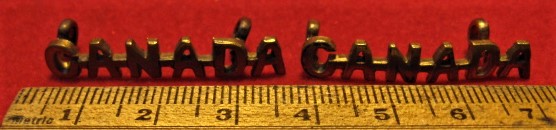 Above are the scans for this WWII era "Canada" shoulder title set of two. These examples are made of brass. The lettering is smaller in size to the RCHA lettering in that listing. They come with both horizontal welded lugs original and in good order...