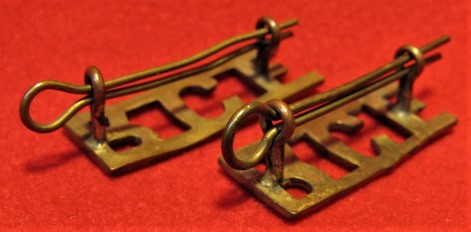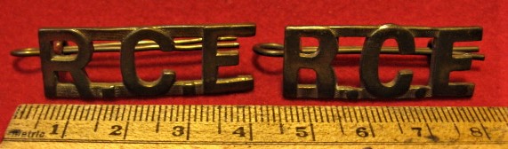 Above are the scans for this WWII era "RCE" (Royal Canadian Engineers) shoulder title set of two. These examples are made of brass. The lettering is large, similar in size to the RCHA lettering in that listing. They come with both horizontal welded lugs original and in good order as well as the accompanying cross pins as found...