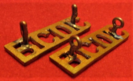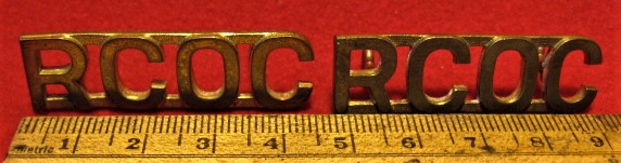 Above are the scans for this post WWII era "RCOC" (Royal Canadian Ordinance Corps) shoulder title set of two. These examples are made of brass. The lettering is large, similar in size to the RCHA lettering in that listing. They come with both horizontal welded lugs original and in good order...
