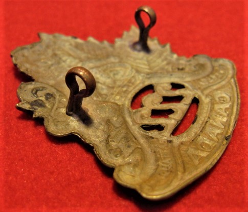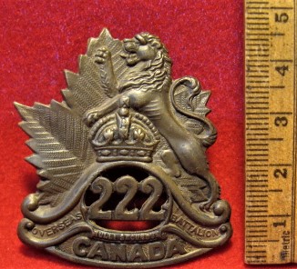 Above you may view the scans for this WWI era 222nd Battalion cap badge. It is made of browning copper. Has both lug type attachments original and in good order.