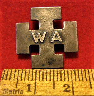 Above are the scans for this WWII era Women's Auxiliary War Service badge. It is not hallmarked but appears to be silver as is the other larger one now in inventory. Comes with original cross pin attachment. An excellent rendering of a period badge.