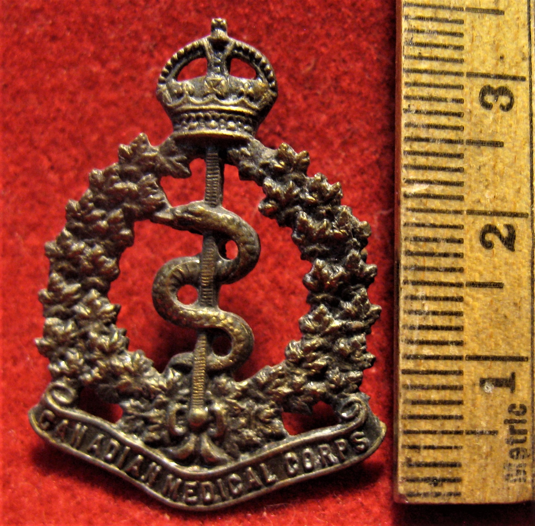 Design is a King's Crown, with a caduceus, encircled by a wreath of maple leaves. Has the "Canadian Army Medical Corps" motif