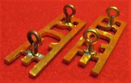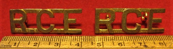 Above are the scans for this post WWII era "RCE" (Royal Canadian Engineers) shoulder title set of two. These examples are made of brass. The lettering is smaller than the previous and the badge has a heavier construction. They come with both horizontal welded lugs original and in good order.