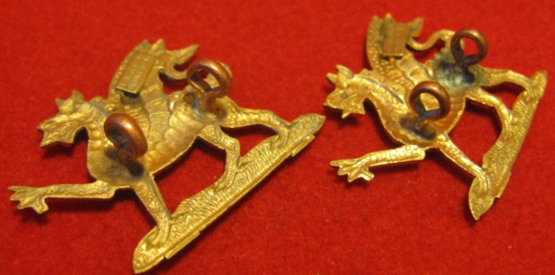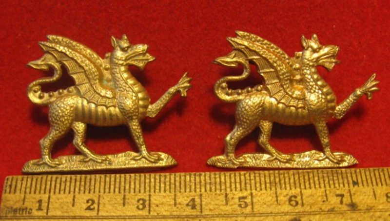 Above are the scans for two collar badges, brass version of a WWI era Canadian Buffs. All original welded stem lugs intact and in good order. Badge condition is