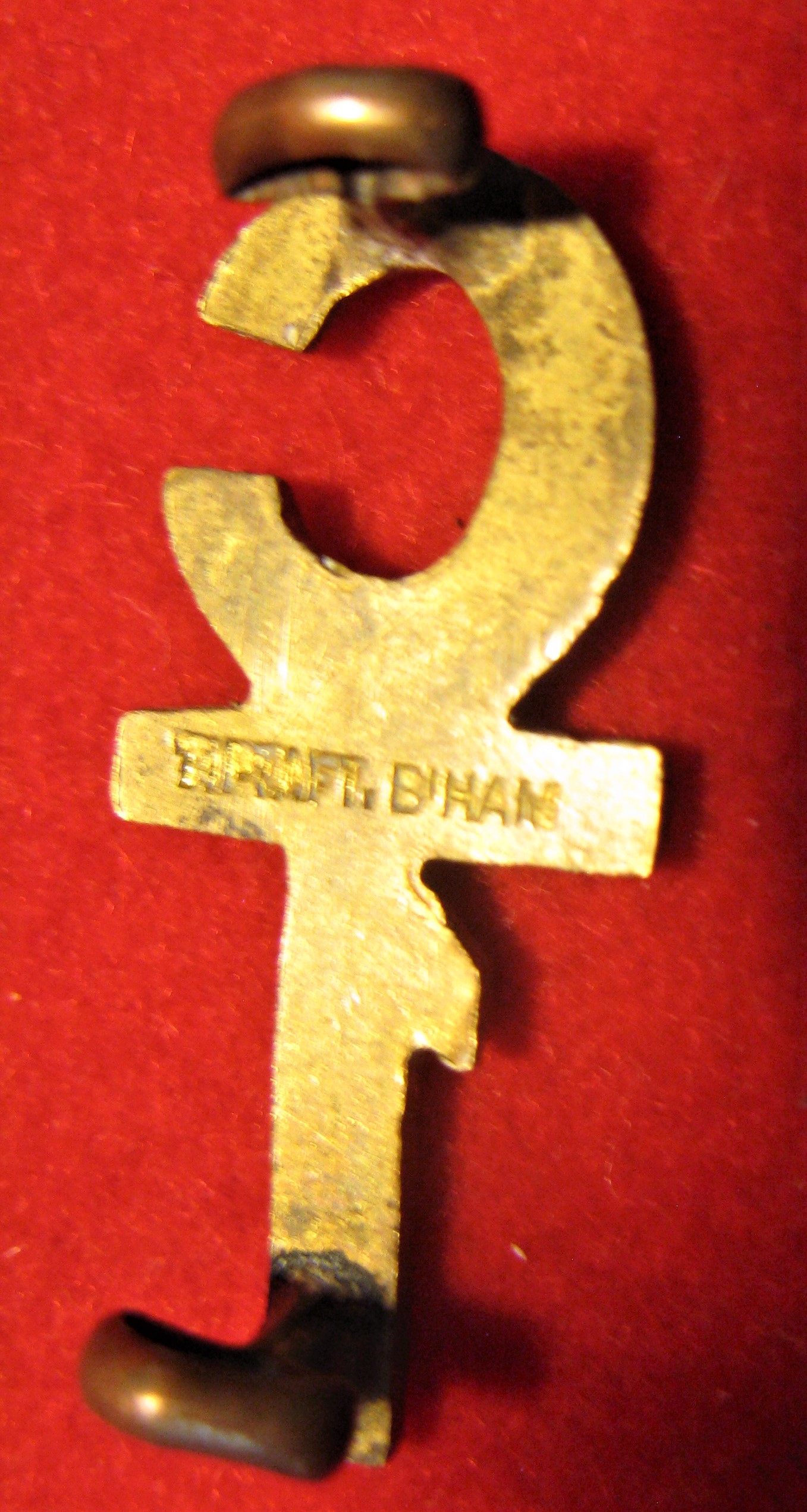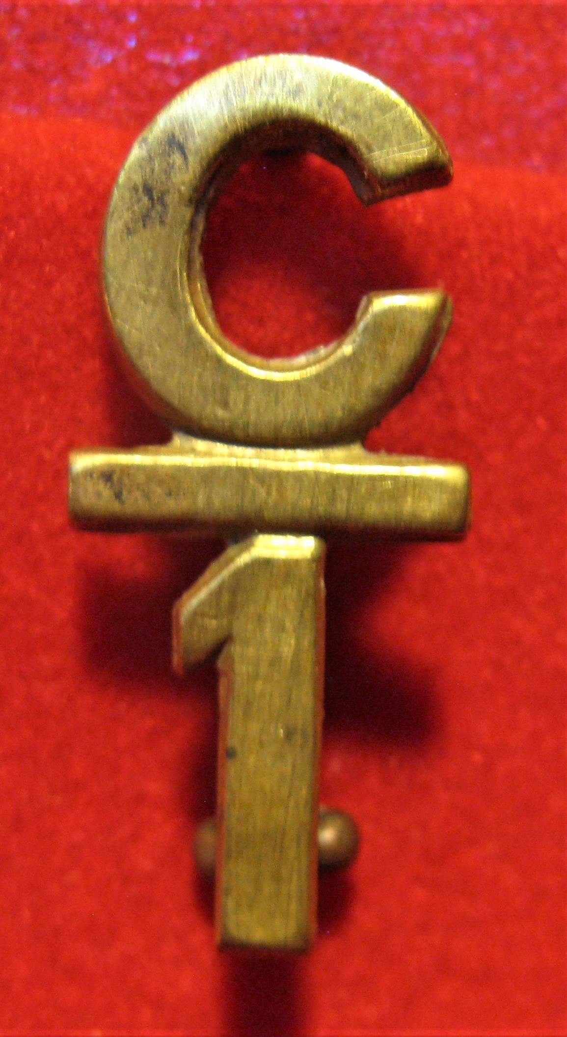 Above are the scans for a Canadian 1st CEF Batallion, 1st Infantry Battalion (Western Ontario) "C over1" collar badge. Made of brass. Two original lugs on the back in excellent condition. Comes clearly marked with a "Tiptaft - B'Ham" hallmark.