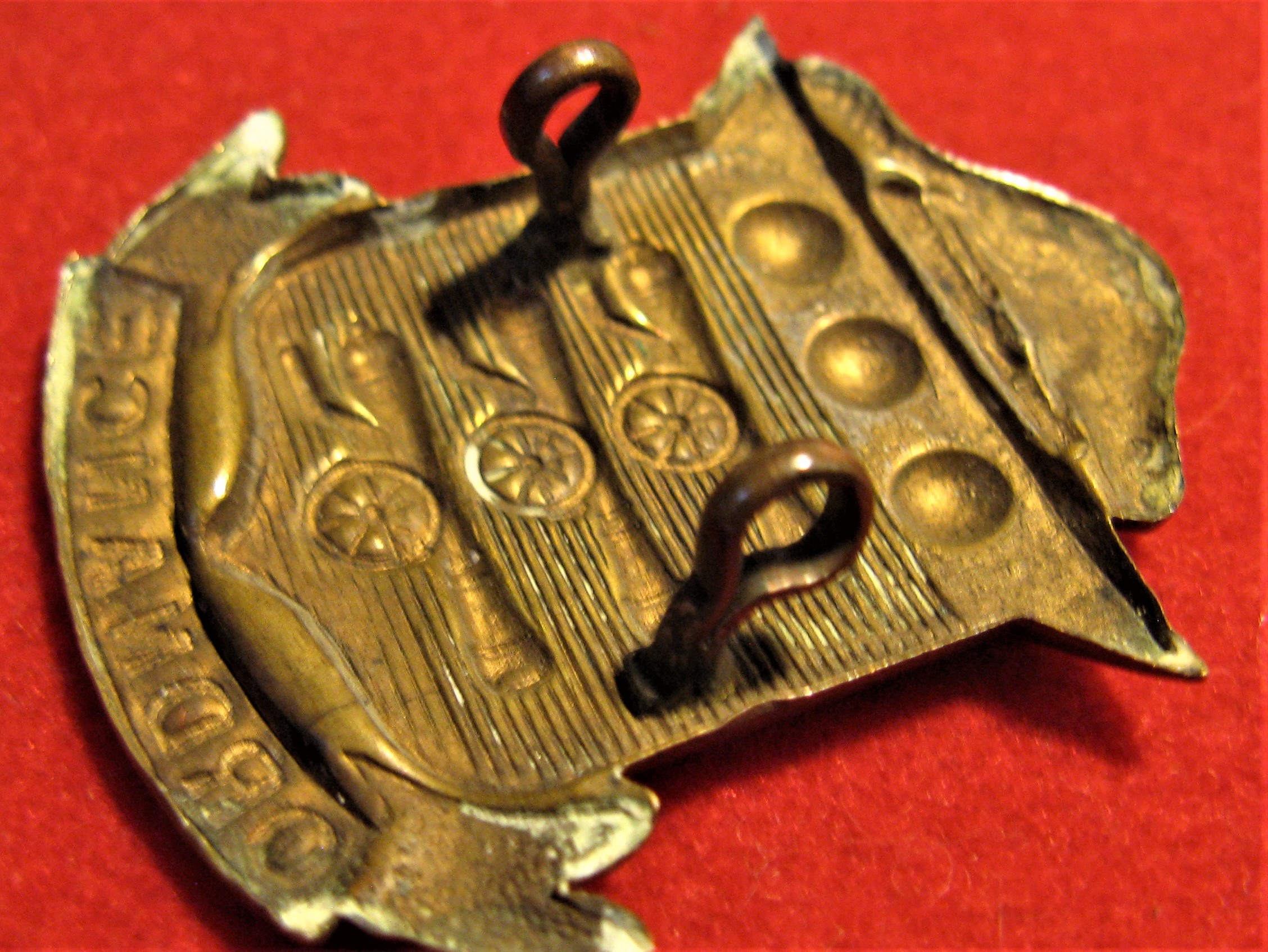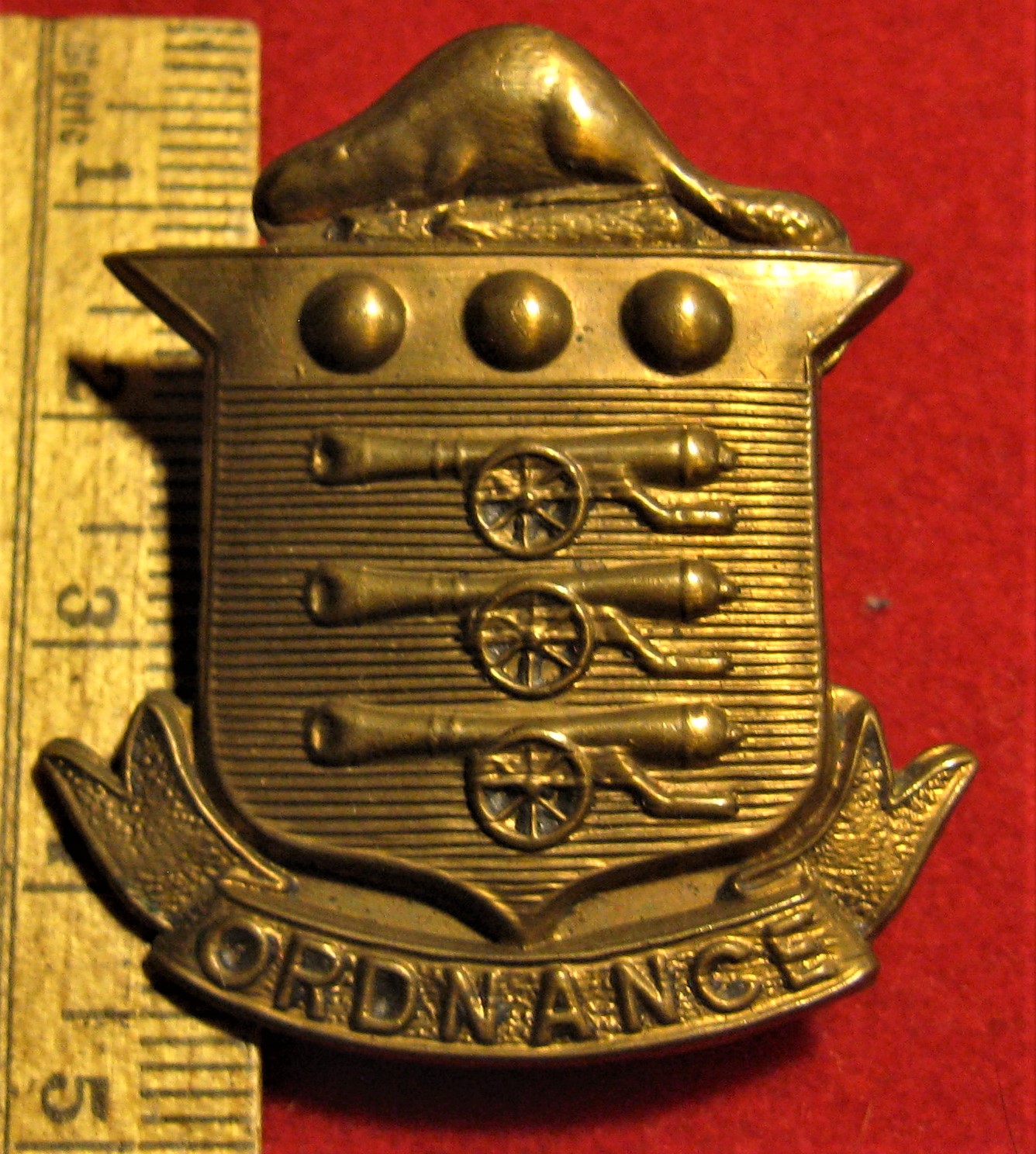 Above are the scans for this Canadian Ordinance Corps Cap Badge for the WWI era. A fine clean example with all original lugs. Hard to find crisp COC o/r brass cap badge. The beaver over the badge shows that it is a Canadian version and not a British badge. Note the absence of the "Royal" designation, since that was added post WWI by George V.