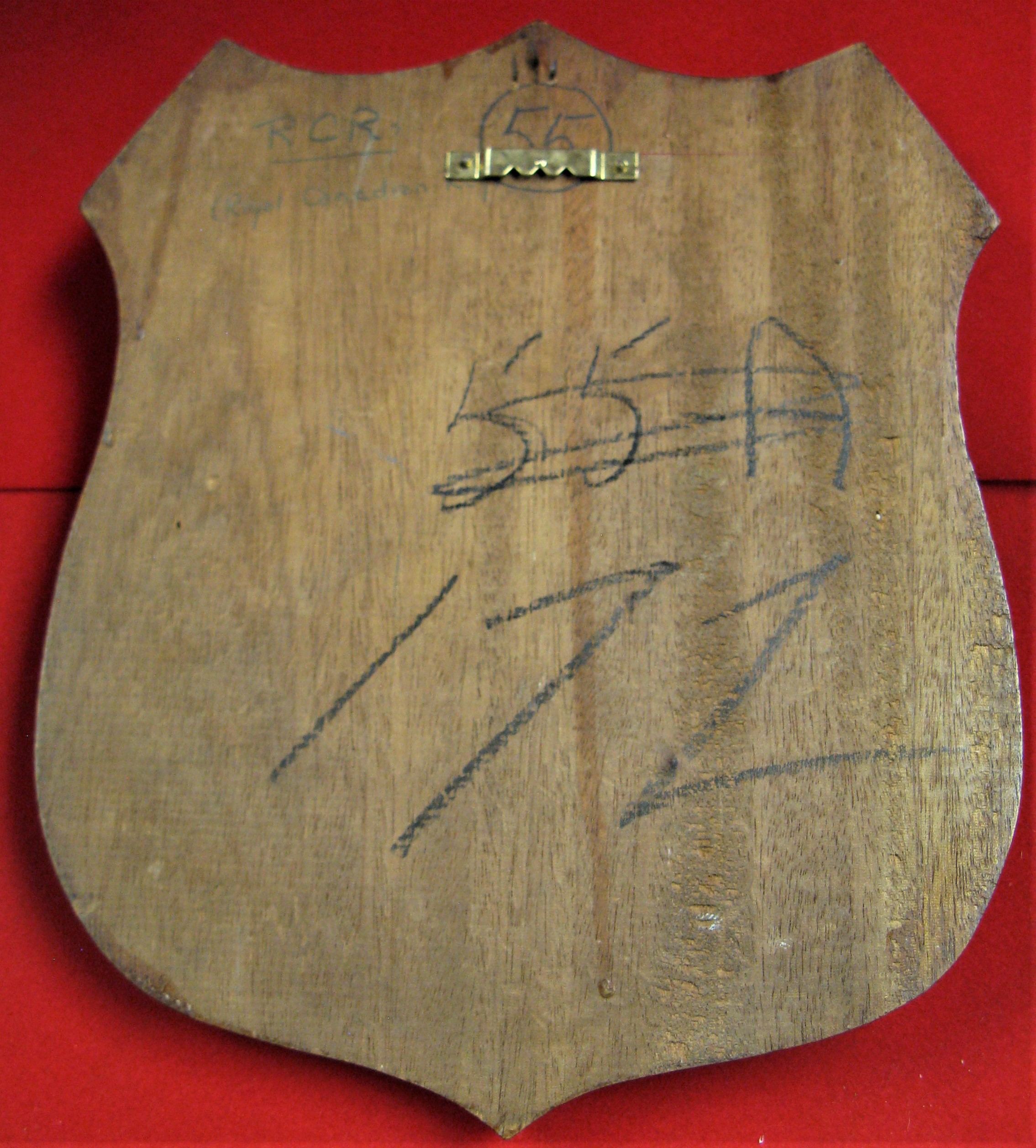 Above you may view the scans for this unique and excellently crafted plaque bearing the Royal Canadian Regiment's regimental insignia. Made of wood and beautifully carved.