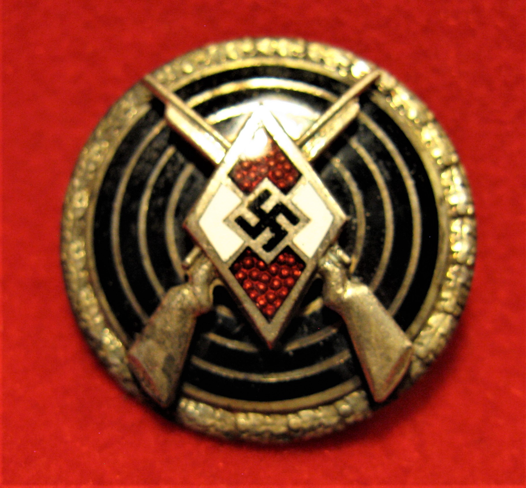 You are viewing a German WW2 Era Hitler Youth Marksman award lapel pin. This one has its original cross pin intact and in good order. The badge is very good condition, with its gold ring perfectly intact.