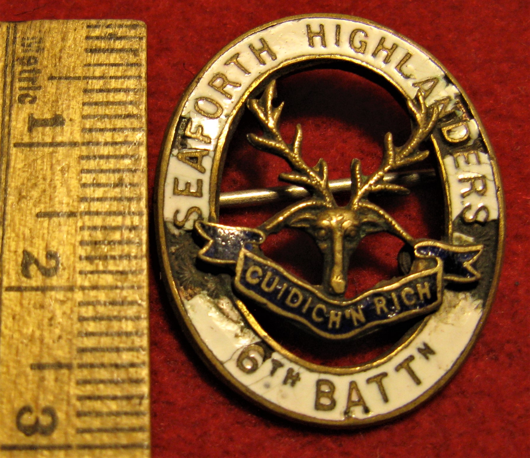 You are viewing a WWI era Oval Seaforth Highlanders Sweetheart broach. Made of brass and has a straight pin type attachment. Has "Seaforth Highlanders 6th Battalion inlaid