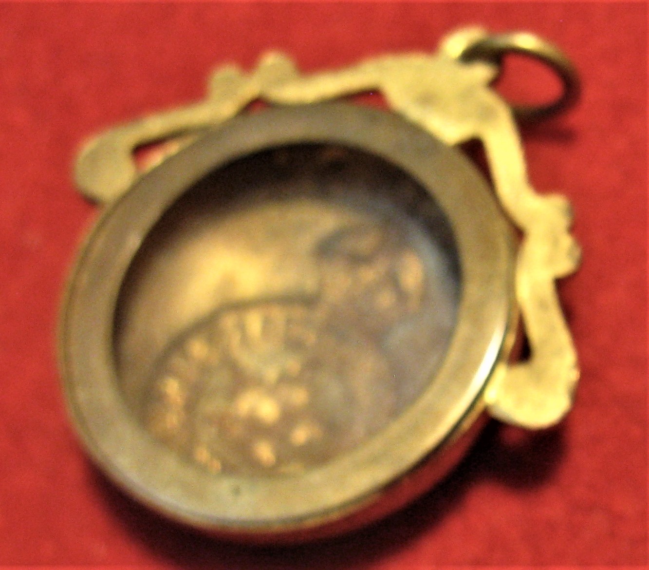 It is made of brass, perhaps originally a uniform button, but transformed into a pendant by adding an exotic bezel to the button and removing the back attachment piece and
