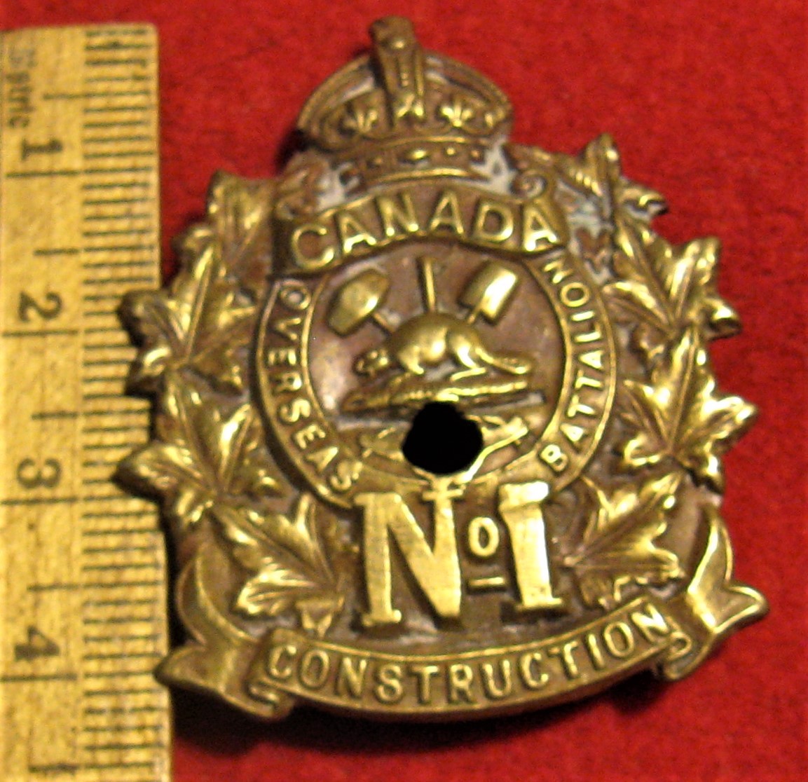 You are about to view the scans of a rare CEF No.1 Canadian Construction Battalion cap badge. This beautiful badge is made of heavy brass, a genuine item from WWI, with real nice age patina. Both lugs original and in good order. However this badge is "holy". someone drilled a hole in the badge most likely an attempt at displaying it. I have seen others like this so someone had a collection and may have drilled holes in them for mounting purposes.